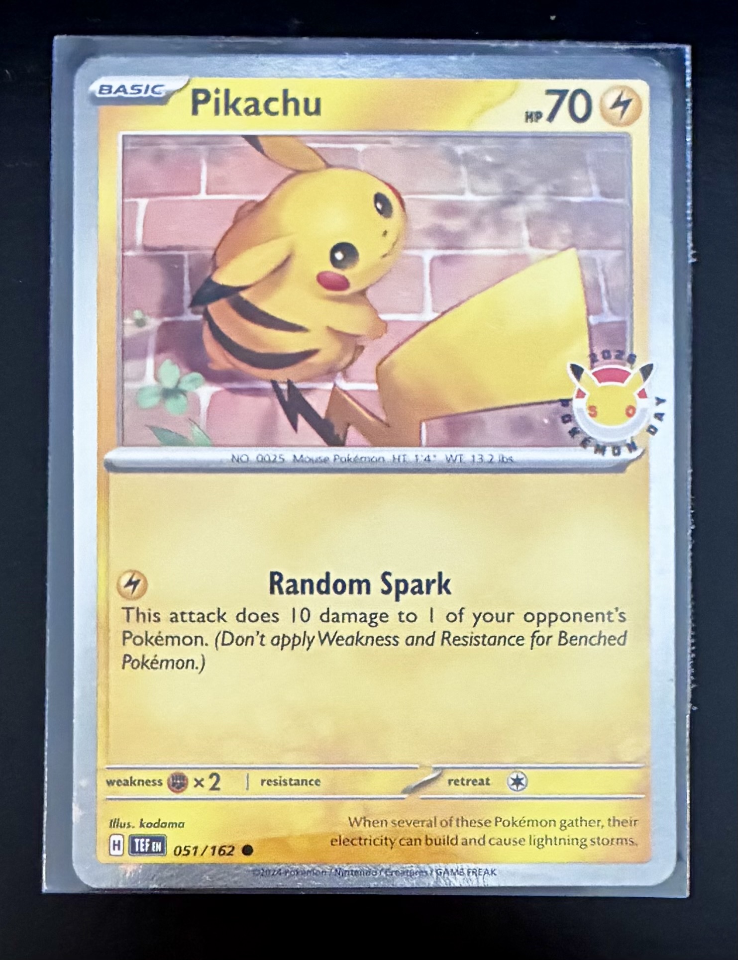 Charge up your binder and strike first with this 2023 Pokémon Day–stamped Pikachu, card 051/162 of the English Pokémon TCG. This Lightning-type dynamo flashes 70 HP and the precision attack Random Spark, letting you snipe 10 damage anywhere on your opponent’s board and chip away at key Benched targets without Weakness or Resistance slowing you down. Kodama’s artwork crackles with energy—Pikachu crouches against a brick wall, tail arcing electricity and daring rivals to step closer. Event-only distribution means you won’t pull this promo from regular packs; each copy hit the market solely through limited 2023 celebrations, creating genuine scarcity. Snatch this rare collectible now to supercharge your Pikachu lineup, thrill promo hunters, and give any holiday-themed binder an instant jolt of star power.